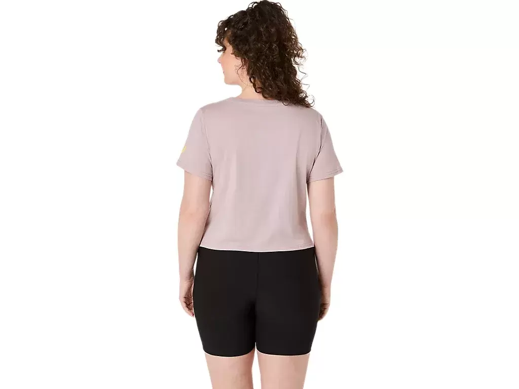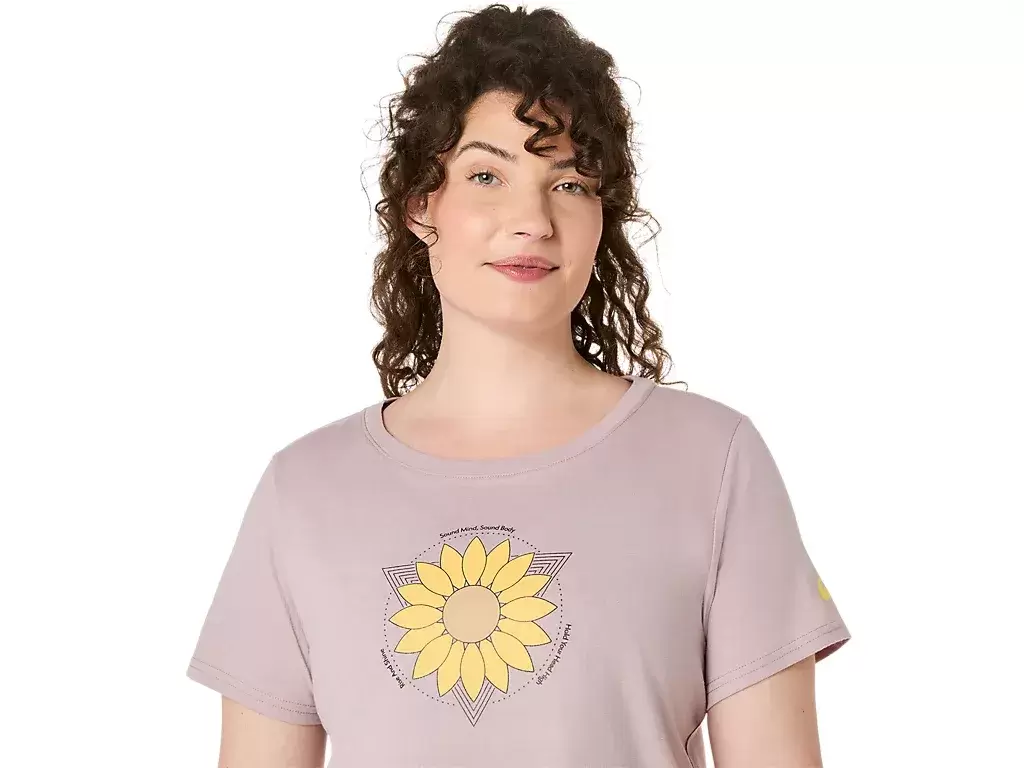 Denna bekväma stickade kortärmade t-shirt har en crop-top-design som accentueras med en solrosgrafik på bröstet.