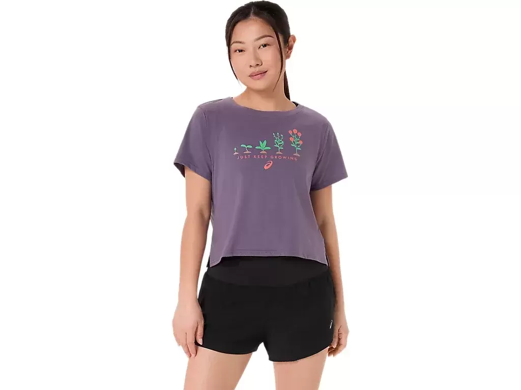 Denna bekväma stickade kortärmade t-shirt har en serie växtgrafik i olika stadier av tillväxtcykeln på framsidan. Den har också frasen ””BARA FORTSÄTT VÄXA”” skrivet nedanför.