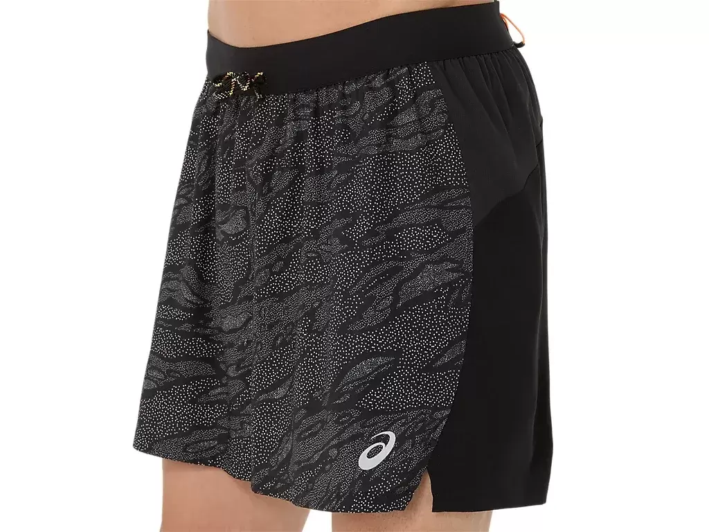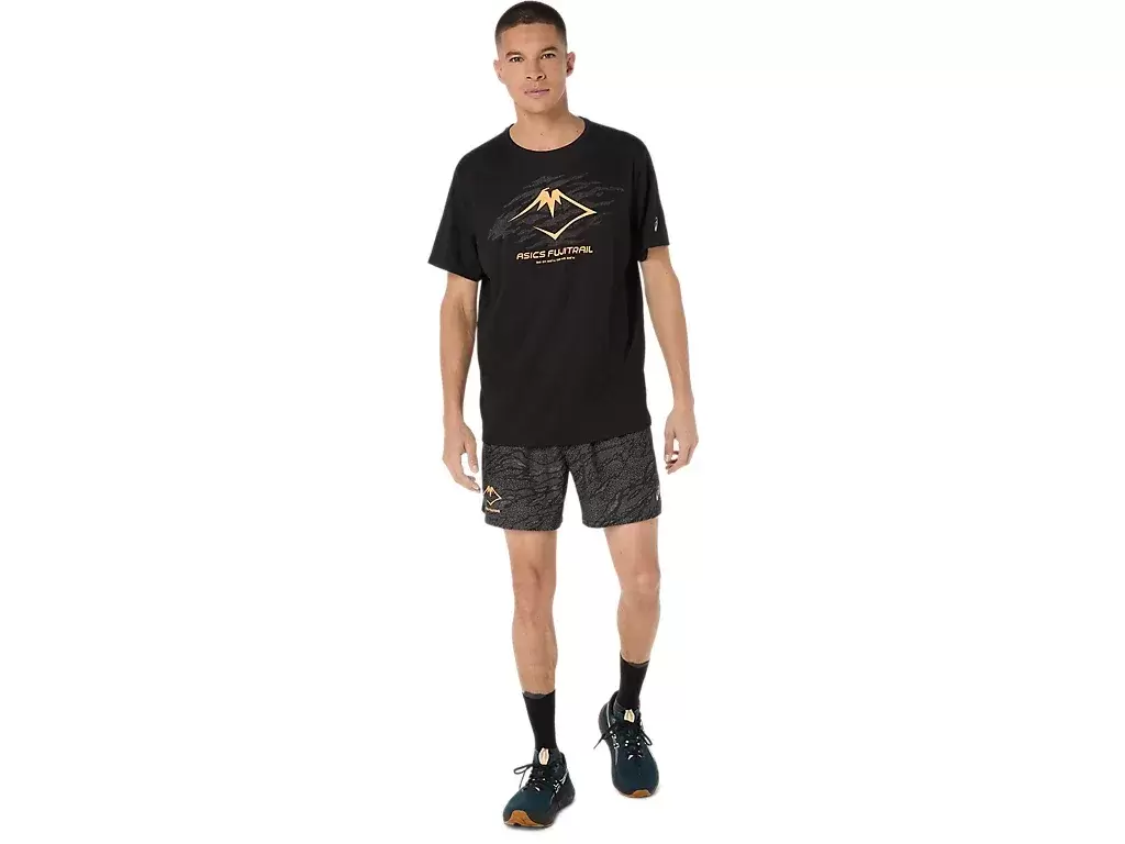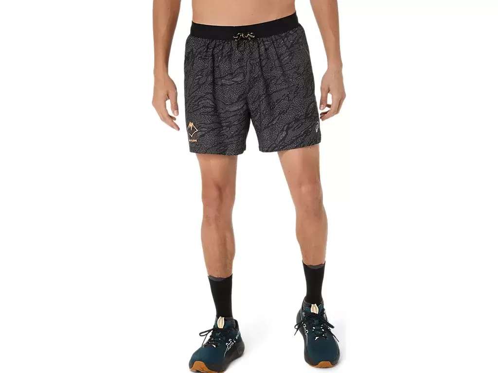FUJITRAIL™-LOGO ALL OVER PRINT 5IN SHORT, inspirerad av offroadlöparäventyr, är en vardaglig prestation som är nödvändig för traillöpning.