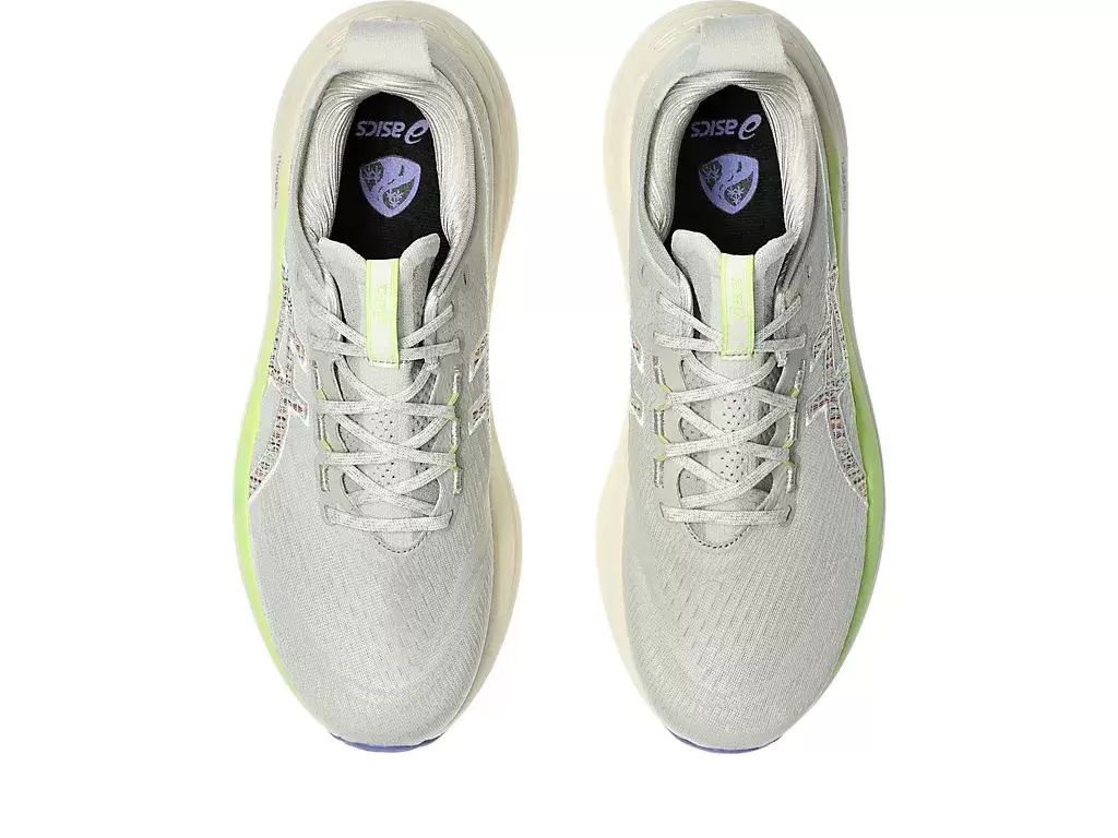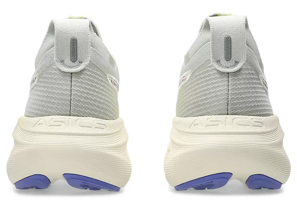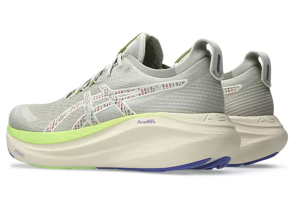 GEL-NIMBUS® 27 NATURE BATHING™ TR skons mjuka dämpningsegenskaper hjälper dig att känna att du landar på moln. Denna design är omarbetad för att skapa en mjukare och smidigare löpupplevelse. Dess färgsättning hämtar inspiration från tropiska kustlandskapselement, som vågor, drivved, stenar och snäckskal.