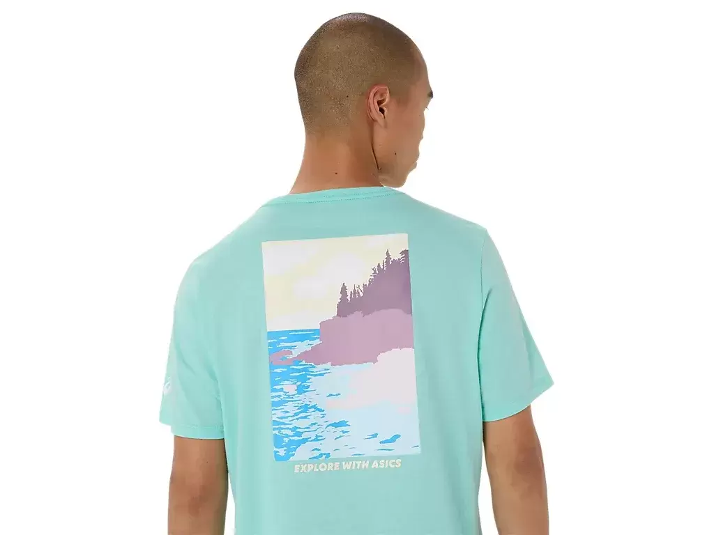 Denna bekväma stickade kortärmade t-shirt hämtar inspiration från natursköna havslandskap. Baksidans grafik har frasen ””UTFORSKA MED ASICS”” som kompletteras med en kustnära trädkantad design.