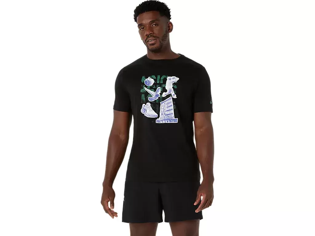 Denna bekväma stickade kortärmade t-shirt är inspirerad av olika New York-tennismotiv och en grafisk applikation genom de olika benämningarna på framsidan.