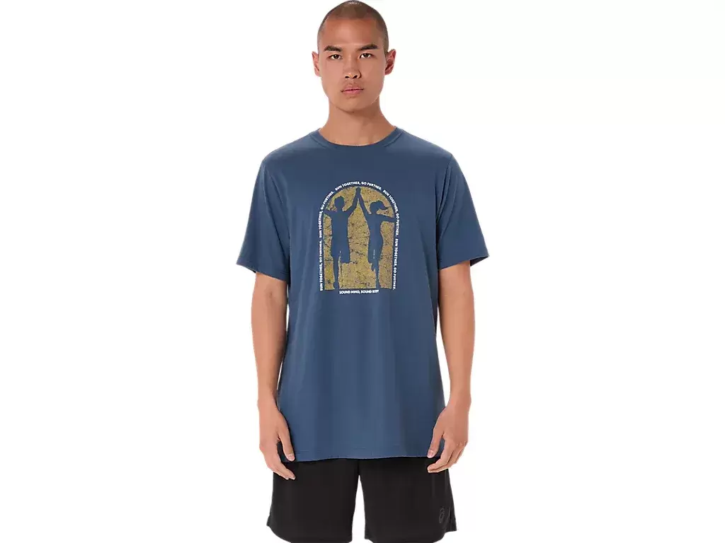 Denna bekväma stickade kortärmade t-shirt erkänner vikten av världens mentala hälsa. Den främre grafiken visar två löpare som slår varandra och frasen ””RUN TOGETHER, GO FURTHER”” cirkulerar i centrumdesignen.